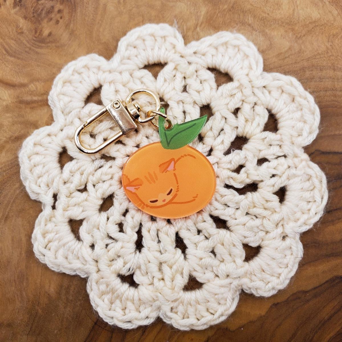 A keychain of an orange! Wait- Hold up- that's not an orange at all! That's an orange kitty! With the way it's all curled into a ball (and with that stem and leaf sticking out) it's understandable to mistake it for an orange upon first glance!