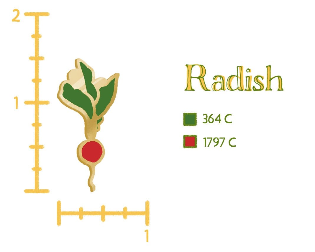 Radish enamel pin measures in at 1½ inches, about 38 mm tall