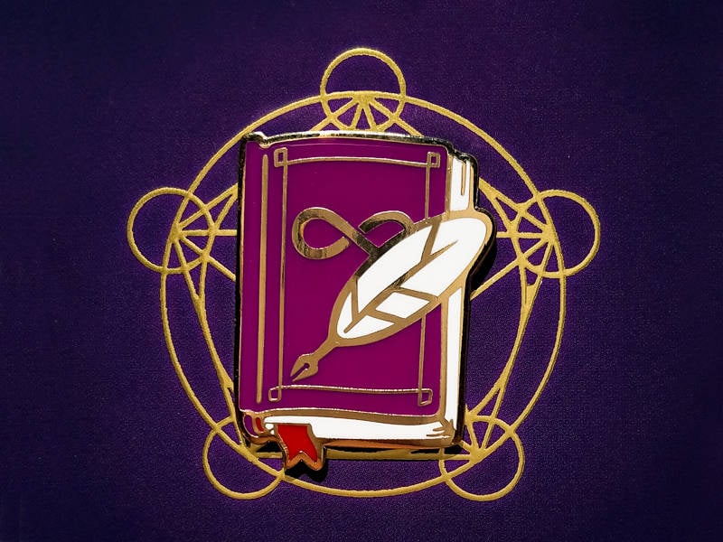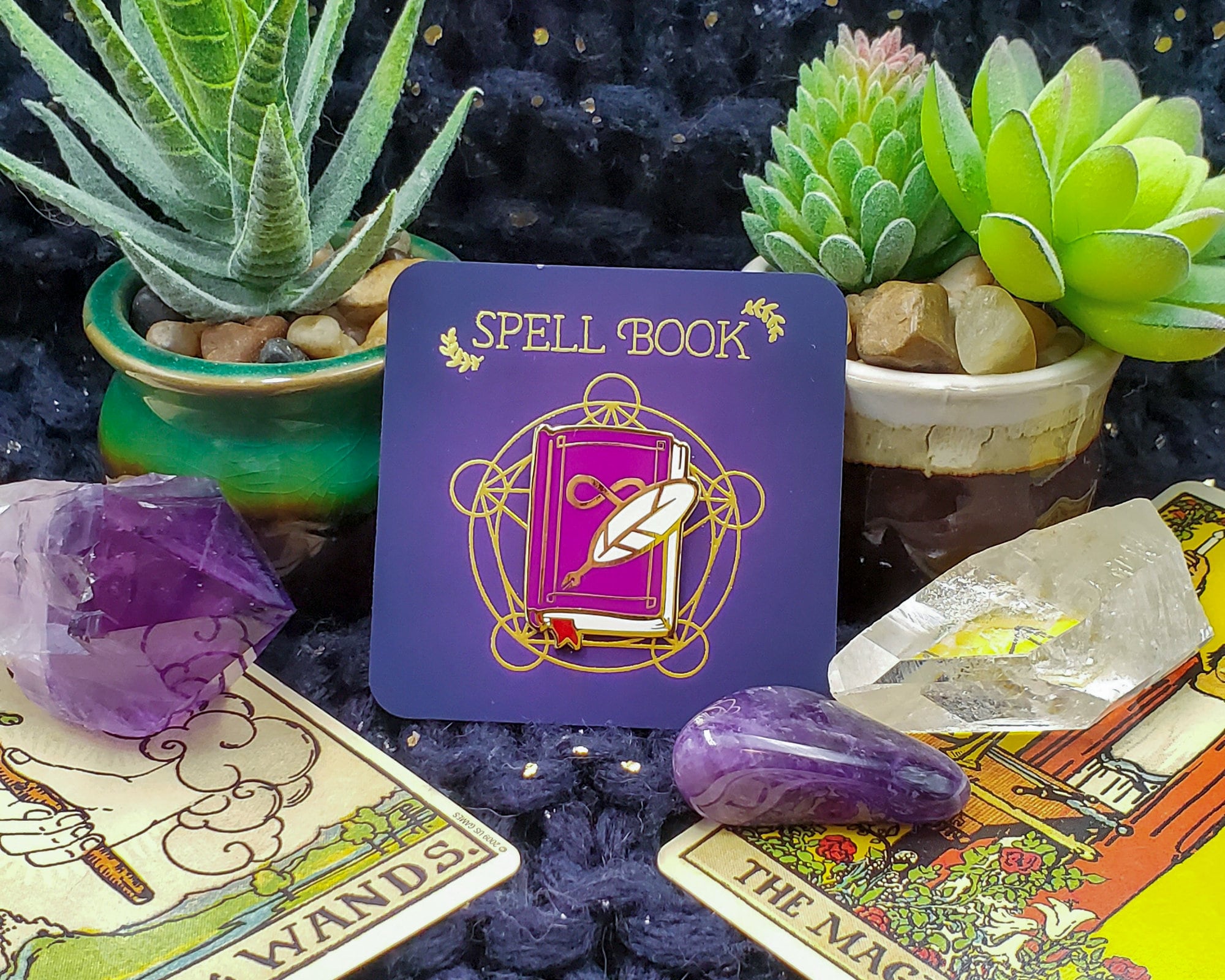 One of my set of gold plated witchy enamel pins! This one features a magical spell book.